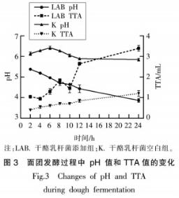 如圖所示3所顯示,伴隨著發(fā)酵時間增加,空缺組(K)pH值和TTA值轉變并不大,殊不知干酪乳桿菌加上組(LAB)的pH值逐步減少,24h后低至3.9,TTA值與pH值轉變呈相對的發(fā)展趨勢。干酪乳桿菌歸屬于異形發(fā)醇乳酸菌飲料,發(fā)醇全過程中乳酸菌、冰醋酸等有機物的新陳代謝造成 面糊pH值降低、TTA值提升。