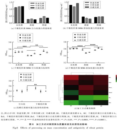 已經(jīng)有研究表明,生產(chǎn)加工方法對食材抗原性轉(zhuǎn)變有極強的危害,為進一步研究干酪乳桿菌對麥子蛋白質(zhì)抗原性的危害,本實驗中使用不一樣發(fā)醇方法制做面糊后煮制或烘烤,并抽樣測量蛋白量濃度及抗原性的轉(zhuǎn)變。由圖6a和6b得知,熱處理后蛋白質(zhì)成分減少。已經(jīng)有科學(xué)研究確認(rèn),熱處理可使蛋白產(chǎn)生溶解或集聚,造成 含水量降低。由圖6c~e得知,沒經(jīng)熱處理時,干酪乳桿菌加上組并沒有具有顯著地減少麥子蛋白質(zhì)抗原性的功效(與未加上組對比),可能是因為發(fā)醇做為一種遲緩地產(chǎn)生方法,管理體系中的胰蛋白酶、肽酶必須的時間和合適的自然環(huán)境充分發(fā)揮酶解功效溶解致敏物原蛋白質(zhì),而本研究室用的3種發(fā)醇方法時間均相應(yīng)較短,盡管冷藏發(fā)酵時間較長,可是4℃的超低溫并無法使酶充分運用功效。經(jīng)厭氧發(fā)酵后烤制解決,一部分解決組抗原性略微提高。已經(jīng)有科學(xué)研究確認(rèn),蛋糕烘焙時美拉德反應(yīng)物質(zhì)很有可能會提高麥子蛋白質(zhì)的過敏源性。如圖所示6e所顯示,經(jīng)冷藏發(fā)酵后煮制,干酪乳桿菌加上組的抗原性顯著降低(與未加上組對比),可能是因為發(fā)醇溶解了一部分難溶過敏源,經(jīng)煮制后,水溶小分子水蛋白質(zhì)產(chǎn)生集聚,遮蓋了抗原體線性表位進而進一步減少了混和發(fā)酵面團的抗原性。如圖所示6f所顯示,色調(diào)由紅到綠意味著抗原性慢慢減少。僅發(fā)醇、發(fā)醇后煮制、發(fā)醇后烤制各自聚大了3類,殊不知干酪乳桿菌加上組)與干酪乳桿菌空缺組并沒有聚大2類,迅速發(fā)醇、中種發(fā)醇和冷藏發(fā)酵聚大了2類,表明干酪乳桿菌做為發(fā)醇種時生產(chǎn)加工方法對麥子蛋白質(zhì)抗原性的危害超過干酪乳桿菌發(fā)醇。中種發(fā)醇和冷藏發(fā)酵中間無明顯差別可是差異于迅速發(fā)醇。除此之外,煮制坐落于生產(chǎn)加工聚類算法圖的最下邊,與圖6c和6d一致。不論是干酪乳桿菌空缺組或是加上組,煮制都不同于發(fā)醇和烘烤,具備能夠更好地減少面糊抗原性的工作能力。在全部解決中,具備明顯優(yōu)點的是干酪乳桿菌加上組冷凍/中種發(fā)醇后煮制。