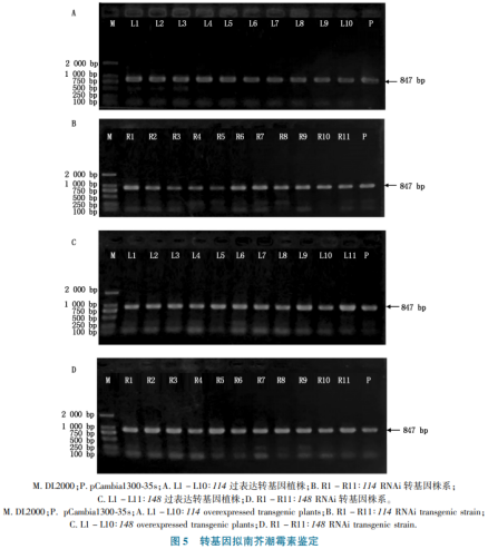經(jīng)潮霉素挑選T0轉(zhuǎn)基因水稻擬南芥種籽后(圖4),對T1開展pCambia1300-35s-114、pCambia1300-RNAi-114、pCambia1300-35s-148及pCambia1300-RNAi-148媒介潮霉素評定,結(jié)果顯示(圖5),目地質(zhì)粒T-DNA均已插進(jìn)擬南芥基因,說明擬南芥轉(zhuǎn)基因水稻取得成功。