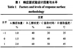 依據(jù)Box-Behnken核心組合原理,在單要素實驗效果的根基上,挑選酶加上量、乙醇濃度、獲取時間和獲取溫度四個要素為變量,每一變量的實驗各自以-1、0、1編號,以黃酮類物質(zhì)獲取率(%)為響應值,開展四要素三水準試驗,運用Design-Expert8.05手機軟件對實驗多元化回歸分析和二項式線性擬合,并對線性擬合方程式開展方差分析。要素水準設計方案見表1。