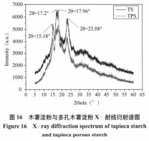 圖16是木薯淀粉與多孔結(jié)構(gòu)木薯淀粉X-放射線透射譜圖,從圖上能夠看得出木薯淀粉在2θ=15.18A,17.2A,17.96A和23.08A有四個特點(diǎn)峰,歸屬于規(guī)范的A型構(gòu)造。如圖所示18中還可以看得出,與木薯淀粉對比,經(jīng)過微波加熱超音波輔助酶打法解決的多孔結(jié)構(gòu)木薯淀粉仍然具備類似的特點(diǎn)峰,僅僅峰型有一定的轉(zhuǎn)變,表明經(jīng)過微波加熱超音波功效沒有使木薯淀粉的分子結(jié)構(gòu)產(chǎn)生明顯更改。