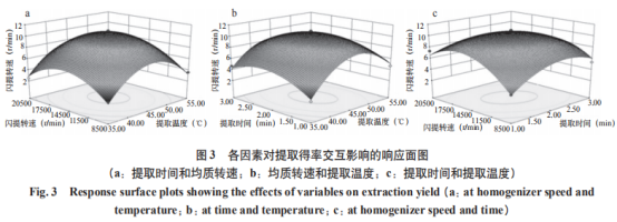 運(yùn)用Box-Behnken軟件,依據(jù)創(chuàng)建的線性回歸方程做出3D響應(yīng)面圖(圖3)。從圖3的3d圖紙中剖析得知,兩要素對(duì)提獲得率的配對(duì)t檢驗(yàn)由大到小先后為閃提速度和獲取溫度>獲取時(shí)間和獲取溫度>閃提轉(zhuǎn)速比和獲取時(shí)間。