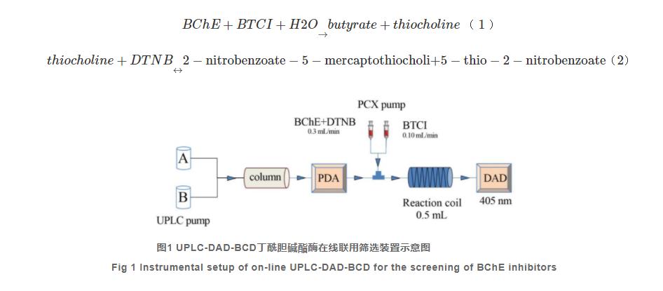 UPLC-DAD-BCD聯(lián)用儀器設(shè)備設(shè)備見圖1。水溶液流路選用三通管和同樣直徑的PEEK管聯(lián)接。柱后衍化儀泵一為酶和DTNB混和水溶液,泵二BTCI水溶液。提取液歷經(jīng)UPLC離子交換柱分離出來后,在PDA探測器表明指紋圖譜,再與柱后衍化儀中的水溶液反映,經(jīng) DAD探測器檢驗獲得活力圖普,酶 DTNB、BTCI水溶液流動速度各自為0.30和0.10 mL·min-1,反映管0.5 mL,在405 nm檢驗酶抑止活力圖普。其反映基本原理如下所示:當柱后衍化儀以穩(wěn)定的流動速度運送BChE與DTNB混和水溶液和BTCI水溶液,3種水溶液在反映管內(nèi)持續(xù)反映,轉(zhuǎn)化成的5-thio-2-nitrobenzoate為淡黃色物質(zhì),可在405 nm處檢驗獲得穩(wěn)定基準線。當UPLC分離出來出活性物質(zhì)進到BChE反映管理體系,淡黃色物質(zhì)量減少,與此同時在DAD探測器上邊便會展現(xiàn)倒峰,進而完成BChE緩聚劑的在線監(jiān)測。