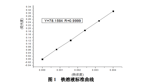 提前準(zhǔn)備 6 個(gè) 25 mL 的容量瓶,各自移取 0.00、2.00、4.00、6.00、8.00、10.00 mL 的 0.010 mg/mL 鐵的標(biāo)液,隨后再各自先后添加 5.0 mL 甲酸—醋酸鈉緩沖液、1.00 mL 抗壞血酸、2.00 mL鄰二氮菲水溶液,加滿水溶液后用純凈水溶解至標(biāo)尺線,混勻,大概置放 15 min 后于 510 nm 處測(cè)各水溶液的吸度,以純凈水做對(duì)照品,濃度值水溶液做空白試驗(yàn),扣減空缺水溶液OD值后,以O(shè)D值為縱軸,鐵濃度值為橫坐標(biāo)軸,制作規(guī)范趨勢(shì)圖,并測(cè)算出該趨勢(shì)圖的線形線性回歸方程及相關(guān)系數(shù)r。該試驗(yàn)統(tǒng)計(jì)數(shù)據(jù)反映該曲線圖線形線性回歸方程為:Y=78.159X,線性相關(guān)指數(shù) R=0.9999,線性相關(guān)優(yōu)良。