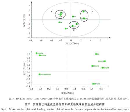 對(duì)發(fā)醇前,發(fā)醇完畢及儲(chǔ)藏期內(nèi)乳酸飲料中所檢驗(yàn)到的8類揮發(fā)物口味成分開展主成分分析法,結(jié)果如圖2所顯示:3種不一樣原料的乳酸飲料區(qū)別顯著,而同樣原料的乳酸飲料在貯藏期內(nèi)遍布貼近,之上結(jié)果顯示:不一樣原料的乳酸飲料經(jīng)復(fù)合益生菌發(fā)醇后,揮發(fā)物類化合物顯著不一樣,而同樣原料的乳酸飲料在儲(chǔ)藏期內(nèi)(T14-T28、D14-D28、Q14-Q28)揮發(fā)物類化合物轉(zhuǎn)變較??;以脫脂乳為發(fā)醇原料的乳酸飲料中,大環(huán)內(nèi)酯化學(xué)物質(zhì)、代烴化學(xué)物質(zhì)、酸類物質(zhì)集聚在第一,二主成份正方向端,且奉獻(xiàn)比較大,大環(huán)內(nèi)酯化學(xué)物質(zhì)根據(jù)糖酵解途徑、一部分碳水化合物的溶解、油酸的空氣氧化及其有關(guān)微生物菌種的新陳代謝產(chǎn)生,具備香甜、芳香和脂質(zhì)的油膩感氣場(chǎng),代烴化學(xué)物質(zhì)多見化工中間體化學(xué)物質(zhì),物理性質(zhì)開朗,是發(fā)醇乳品中主要的乳酸乙酯化學(xué)物質(zhì),酸類物質(zhì)一般為C2-C10的飽和脂肪,關(guān)鍵產(chǎn)生于蛋白和脂質(zhì)的水解反應(yīng)新陳代謝方式,對(duì)乳酸飲料的味道造成直接影響并授予其清新口味。以豆乳為發(fā)醇原料的乳酸飲料中,酯類化合物集聚在第一主成份正方向端,且奉獻(xiàn)比較大,發(fā)醇乳品中的脂類化學(xué)物質(zhì)是由堿類化學(xué)物質(zhì)和醛類化學(xué)物質(zhì)產(chǎn)生酯化反應(yīng)或催化反映產(chǎn)生的,因?yàn)槠溟y值較低,對(duì)發(fā)醇奶制品的口味危害比較顯著,可以授予其乳酪香和芬芳;以乳清蛋白為發(fā)醇原料的乳酸飲料中,醛類化學(xué)物質(zhì)、含碳?xì)浠衔锛墼诘诙鞒煞菡较蚨?,且奉獻(xiàn)比較大,醛類化學(xué)物質(zhì)的產(chǎn)生與羥基酮復(fù)原、脂肪酸溶解及糖類與碳水化合物的排泄相關(guān),其可以與乳香均衡,能夠更好地改進(jìn)發(fā)醇奶制品的口味,含碳?xì)浠衔镩y值較高,對(duì)發(fā)醇奶制品的總體口味危害相比較小。