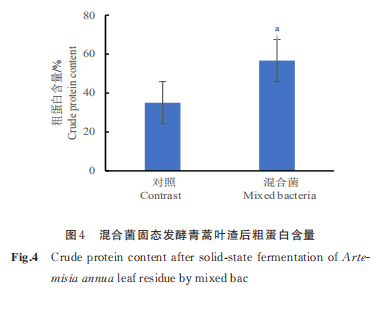 依據(jù)上述單一菌苗固態(tài)發(fā)酵青篙葉渣后粗蛋白、雙氫青篙酸、青篙乙素成分轉(zhuǎn)變結(jié)果,挑選酵母、乳酸菌及枯草枯草芽孢菌構(gòu)成混和菌,發(fā)醇青篙葉渣。如圖所示 4、圖 5 所顯示,青篙葉渣經(jīng)混和菌固態(tài)發(fā)酵后,粗蛋白成分提升了61. 73%(P<0. 05),雙氫青篙酸成分提升了82. 76%(P<0. 05),青篙乙素成分提升了69. 15%(P<0. 05)?;旌途虘B(tài)發(fā)酵青篙葉渣作用成份成分提高明顯,為探尋青篙葉渣做為小動(dòng)物飼料添加物的開(kāi)發(fā)設(shè)計(jì)產(chǎn)給予理論創(chuàng)新。