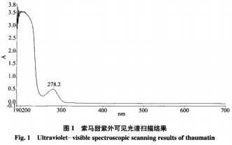 由圖1能夠看得出,索馬甜具備蛋白類物質(zhì)典型性的紫外線可見光譜,因為蛋白質(zhì)的功能中脂環(huán)氨墓酸谷氨酸、色氨酸、苯丙氨酸的存有,促使其在280nm附近有特點消化吸收峰,在這里地區(qū)較大消化吸收光波長為278.2nm。盡管在200nm附近有更強的消化吸收,但鑒于大部分化學(xué)物質(zhì)在這里地區(qū)有消化吸收,為防止影響,采用278.2nm做為事后剖析的根據(jù)。