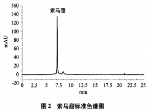 殊不知,中國未有對于索馬甜的檢查辦法規(guī)范,對其檢查辦法的消息也很少,僅厚為光偉等運用高效率液相色譜儀一揮發(fā)光探測器對于包含索馬甜以內(nèi)的甜味素檢驗辦法的科學(xué)研究。文中初次根據(jù)色譜分析和電泳原理法創(chuàng)建飲品中索馬甜的剖析測試標準,在其中常用色譜分析以DAD為探測器相較通用性探測器具備可選擇性,能夠發(fā)揮一定的判定功效,除此之外,根據(jù)SDS-PAGE進一步證實,針對比較繁雜的食品類栽培基質(zhì),可以得到更加穩(wěn)定的結(jié)果。