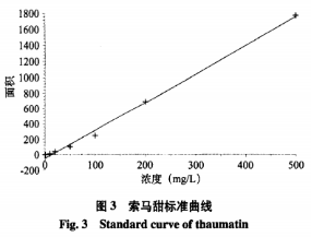 各自向不一樣種類飲品試品中加上25mg/L、50mg/L、200mg/L不一樣含量的索馬甜,每一個加標試品依照所確立的方式反復(fù)測量6次,測算利用率和精度。