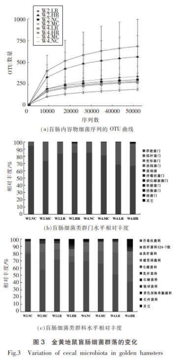 2)高抗性淀粉干涉4星期過(guò)后,盲腸中厚壁菌門(mén)的總量降低,擬桿菌門(mén)和形變菌門(mén)的數(shù)目提升;象征性優(yōu)點(diǎn)病菌瘤胃革蘭陰性桿菌科、毛螺菌科、擬桿菌科S24-7組和梭菌屬的進(jìn)化速率提升,合理緩解了因高脂肪飲食搭配造成 的盲腸有益菌失調(diào)。