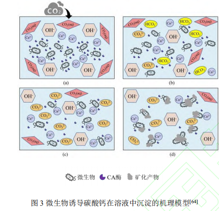 運用 CA 誘發(fā)酸化是一種高效率、平穩(wěn)、綠色生態(tài)友善且可長時間存儲 CO2的方式 。研究表明 CA 能夠加速 CaCO3的沉積速度,CaCO3 的關(guān)鍵晶相為白云石。研究表明 CA 有益于建立比較穩(wěn)定的CaCO3,并根據(jù)產(chǎn)生新的晶向明顯變化其形狀。CA誘發(fā) CaCO3 沉積的本質(zhì)是催化反應水里 Ca2 和 CO2 的反映。微生物菌種產(chǎn) CA 誘發(fā) CaCO3沉積原理如圖所示 3所顯示,(a)CA 病菌的繁衍和碳酸酐酶的造成;(b)HCO3-向 CO32-的生成和轉(zhuǎn)換;(c)CO32-的很多產(chǎn)生和 CA 病菌對 Ca2 的吸咐;(d)酸化物質(zhì)的堆積。