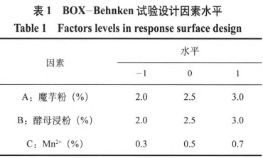 在單要素試驗(yàn)效果的根基上,對發(fā)醇培養(yǎng)液構(gòu)成開展響應(yīng)面提升。選擇變量要素為A-魔芋精粉、B-酵母菌浸粉、C-Mn22 ,響應(yīng)值(R1)為酶活。應(yīng)用手機(jī)軟件Design-Expert10.0.7對以上要素開展回應(yīng)斜面多元回歸分析,對發(fā)醇培養(yǎng)液的構(gòu)成開展提升。BOX-Behnken實(shí)驗(yàn)要素水準(zhǔn)表如表1: