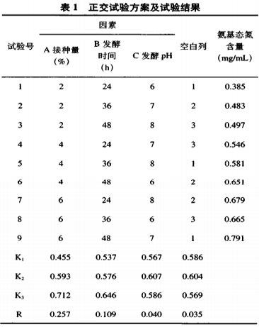 在固定不動料液比l:4(g/mL),發(fā)醇溫度37℃和葡萄糖水加上量2%的根基上,對單要素實驗的信息效果開展解析并選擇適合的發(fā)醇標(biāo)準(zhǔn)范疇,以發(fā)醇pH、接種量、發(fā)酵時間為首要要素,并以測量的羥基態(tài)氮成分做為參照,開展三要素三水準(zhǔn)L9(33)正交和提升實驗,實際試驗方案和結(jié)果見表1。