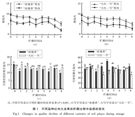 果皮硬度和果肉硬度是反映火龍果耐貯性的重要指標,能夠直觀反映火龍果果實采后軟化的程度。如圖1a和圖1b所示,在25℃貯藏條件下,隨著貯藏時間的延長,火龍果的果皮硬度和果肉硬度逐漸下降,貯藏后期隨著腐敗嚴重,硬度下降很快。“玫瑰香”品種在第3天和第5天,“大紅一號”品種在第2天和第5天硬度均有上升現(xiàn)象,可能是由溫度較高,火龍果過度失水導(dǎo)致。“玫瑰香”品種火龍果在貯藏期問,果皮硬度下降了45.86%,果肉硬度下降了68.35%:“大紅一號”品種火龍果在貯藏期間,果皮硬度下降了46.68%。果肉硬度下降了59.28%。