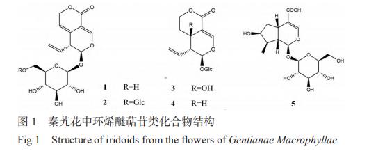 環(huán)烯醚萜苷類成分是秦艽組植物花中所含的主要成分。賈娜等運用多種分離手段對陜西產(chǎn)大葉秦艽花中的化學成分進行系統(tǒng)分離得到多個化合物,并運用多種波譜學手段,輔以對照品對照,從中鑒定出龍膽苦苷(1)。李雨蔚等從西藏秦艽花的95%乙醇提取物中新分離得到4個環(huán)烯醚萜苷類化合物,分別為6'-O-β-D-葡萄糖基龍膽苦苷(2)、獐牙菜苦苷(3)、獐牙菜苷(4)和馬錢苷酸(5),其中化合物1~4為裂環(huán)環(huán)烯醚萜苷類化合物,5為環(huán)烯醚萜苷類化合物。秦艽花中環(huán)烯醚萜苷類成分見表2,結(jié)構(gòu)見圖1。