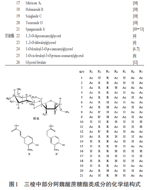 三棱以阿魏酸、p-香豆酸以及二者蔗糖酯、甘油酯的衍生物為主要成分,目前共發(fā)現(xiàn)21個(gè)阿魏酸蔗糖酯衍生物和5個(gè)阿魏酸及p-香豆酸甘油酯衍生物,其具體化合物名稱見(jiàn)表1,部分成分化學(xué)結(jié)構(gòu)式見(jiàn)圖1。由圖1可見(jiàn),阿魏?;_B在果糖的3、6位上,糖基上有不同程度的乙?;鶊F(tuán)(0~4 個(gè)乙?;┤〈籆6-C3部位的雙鍵既有反式又有順式結(jié)構(gòu),其中反式雙鍵較穩(wěn)定且更為常見(jiàn)。
