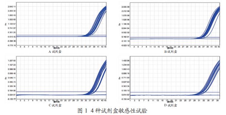 使用純水做無模板陰性,每種試劑盒配置46個陰性反應,設置陰陽性對照,統(tǒng)計不同試劑盒出現(xiàn)假陽性(有Ct值且曲線不典型)的次數(shù),A試劑盒未檢到陽性,B試劑盒未檢測到陽性,C試劑盒檢測2個非特異性陽性反應,D試劑盒檢測到1個非特異性陽性反應,具體結果見圖2與表4。