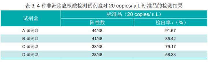 將B646L基因標準品稀釋至20copies/μL,使用4種試劑盒對稀釋后的標準品進行熒光PCR擴增,每種試劑盒重復檢測48個孔,統(tǒng)計該拷貝數(shù)下不同試劑盒的檢出率。