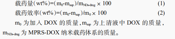 為了驗(yàn)證DOX是通過(guò)共價(jià)連接MPRS,采用紫外-可見(jiàn)分光光度計(jì)檢測(cè)MPRS、DOX、MPRS-DOX在800~200nm波長(zhǎng)范圍內(nèi)的紫外-可見(jiàn)光譜。取適量MPRS分散液、DOX溶液、MPRS-DOX分散液稀釋至一定的濃度,然后利用紫外-可見(jiàn)分光光度計(jì)檢測(cè)。將MPRS與不同濃度(0.1,0.2,0.4,0.8,1mg/mL)的巰基化阿霉素溶液混合,在37℃避光振蕩24h,以12500r/min離心45min,收集上清液,通過(guò)紫外分光光度計(jì)測(cè)試其載藥能力。根據(jù)公式(1)和(2)推算出MPRS-DOX的載藥量以及載藥效率。