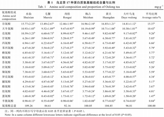 福建省烏龍茶產(chǎn)區(qū)的常見(jiàn)烏龍茶樹(shù)(‘水仙’‘肉桂’‘毛蟹’‘梅占’‘黃旦’‘大葉烏龍’)鮮葉中的17種蛋白質(zhì)氨基酸含量見(jiàn)表1。由表1可知,烏龍茶中各種氨基酸含量差異顯著;其中,谷氨酸、天冬氨酸和亮氨酸含量較高,含量占總氨基酸含量的33.55%~36.59%。選擇含量較高(>5.0mg儋)的天冬氨酸、谷氨酸、亮氨酸、丙氨酸、甘氨酸、苯丙氨酸、賴氨酸和精氨酸8種氨基酸(占總氨基酸含量的69.24%~71.21%)作為專用配方氨基酸的組份。從8種主要氨基酸的含量分別算出各種氨基酸所占比例,從而得到烏龍茶樹(shù)的專用配方氨基酸葉面肥配比為:16%天冬氨酸、24%谷氨酸、14%亮氨酸、10%丙氨酸、9%甘氨酸、9%苯丙氨酸、9%賴氨酸和9%精氨酸。