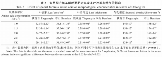 噴施氨基酸葉面肥對(duì)烏龍茶樹(shù)葉片生長(zhǎng)起到直接作用,葉面積大小、葉片厚度和葉片的氣孔密度均發(fā)生變化。由表3可知,噴施專用配方氨基酸葉面肥顯著提高了茶樹(shù)氣孔密度;“鐵觀音”的葉面積、葉片厚度和氣孔密度分別增加了11.70%~21.16%、12.90%~22.58%和9.38%~21.88%,但差異不顯著;“本山”的葉面積、葉片厚度和氣孔密度分別增加了15.85%~17.73%、18.18%~31.82%和9.72%~20.83%,但差異不顯著。不同濃度氨基酸處理下,葉片形態(tài)特征存在差異,1.5g/L處理的葉面積、葉片厚度和氣孔密度高于其他處理。因此,噴施1.5g/L專用配方氨基酸葉面肥能增加葉片面積和葉片厚度,提高氣孔密度,有利于促進(jìn)氣體交換,提高烏龍茶樹(shù)葉片光合作用。