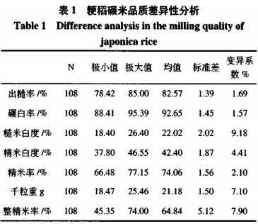 碾米品質(zhì)的差異性分析如表1所示??梢钥闯?,108個(gè)粳稻樣品的碾米品質(zhì)在品種間均存在不同程度的差異情況,其中,出糙率是較為穩(wěn)定的性狀,品種間差異性小,其變異系數(shù)是1.69%,粳稻出糙率通常是在80%以上,參試樣品中有103個(gè)品種出糙率超過(guò)80%。碾白率表示整粒糙米的去皮程度,不受碾米時(shí)產(chǎn)生碎米多少的影響,碾白率在碾磨品質(zhì)中差異性最小,變異系數(shù)為1.57%,所有品種碾白率均超過(guò)88%。糙米白度的變異系數(shù)是9.18%,數(shù)據(jù)離散程度較大,在碾磨品質(zhì)中差異性最大。精米白度變異系數(shù)為4.41%,各品種的精米白度與糙米白度相比差異性較小。精米率受栽培環(huán)境影響較大,其變異系數(shù)是2.10%,數(shù)據(jù)離散程度小,品種間差異性較小。千粒重變異系數(shù)為7.10%,品種間差異性較小。整精米率是碾米品質(zhì)中重要的指標(biāo),整精米率越高其商品價(jià)值也越高,108個(gè)粳稻樣品標(biāo)準(zhǔn)差為5.12,變異系數(shù)為7+90%,不同品種差異較小,參試樣品整精米率達(dá)到稻谷國(guó)標(biāo)(GBT350—2009)中粳稻谷一級(jí)指標(biāo)6l%的品種有81個(gè),占比75%。