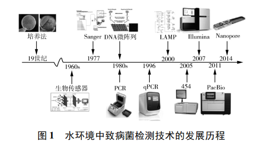 近年來(lái),水環(huán)境中致病菌的檢測(cè)取得了一定的研究進(jìn)展,已從單一基于培養(yǎng)法的傳統(tǒng)致病菌檢測(cè)方法發(fā)展至多種分子生物學(xué)檢測(cè)方法,這些技術(shù)的出現(xiàn)和發(fā)展為致病菌檢測(cè)提供了新的思路。水環(huán)境中致病菌檢測(cè)技術(shù)的發(fā)展歷程見圖 1。