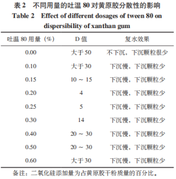 噴撒不一樣使用量吐溫80對卡拉膠分散性危害的檢驗(yàn)結(jié)果見表2。