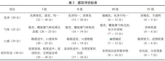 靈芝孢子粉銀杏樹運動型飲料的基本秘方點評選用感觀綜合評分法,參照內(nèi)服飲品感觀評判規(guī)范[9],并融合該飲品的具體特點,制訂點評規(guī)范,實際見表2所顯示。聘用具備飲品感觀點評工作經(jīng)驗的10位食品類工作人員,各自點評不一樣秘方飲品的顏色、味道、口味與機構(gòu)形狀,在評分中除掉最少分和滿分,平均值求整后的結(jié)論就是該秘方試品的感觀得分。