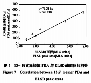 紀(jì)錄不一樣含量的13-順式同分異構(gòu)體、9-順式同分異構(gòu)體和全反式同分異構(gòu)體試品在PDA和ELSD上的峰總面積。二者之間表明出正線性相關(guān)(見(jiàn)圖7~圖9)。