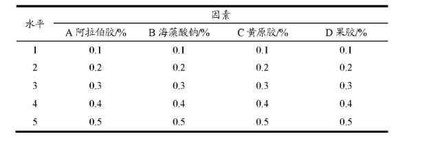 挑選阿拉伯膠、海藻酸鈉、卡拉膠、阿拉伯膠四種純天然添加物做為研究對象,各自考察了4種不一樣添加物在0.1%、0.2%、0.3%、0.4%和0.5%五個水準(zhǔn)上對紅薯粉質(zhì)量的危害,如表1所顯示。