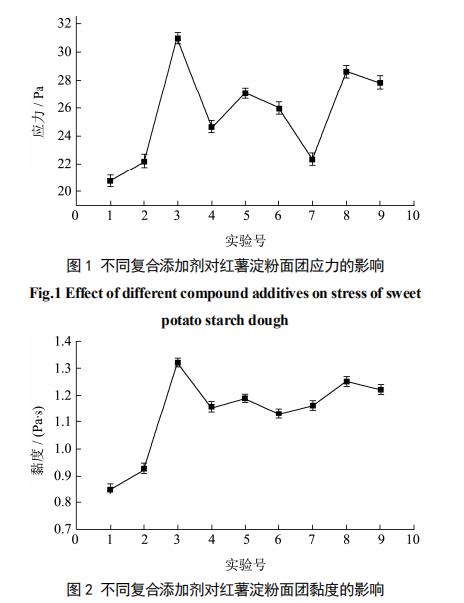 依照1.2.2的實(shí)驗(yàn)方法,根據(jù)正交試驗(yàn),考察了不一樣復(fù)合型添加物對紅薯粉特性危害,結(jié)果如圖所示1和圖2所顯示。由結(jié)果得知,不一樣復(fù)合型添加物對紅薯粉特性的危害具有顯著差別,在其中3號、6號和9號添加物對木薯淀粉的地應(yīng)力的提高較大,相匹配試品的地應(yīng)力各自為30.95、28.60、27.74Pa。而2號和2號添加物則對木薯淀粉地應(yīng)力危害最少,地應(yīng)力尺寸各自為20.69、22.07Pa