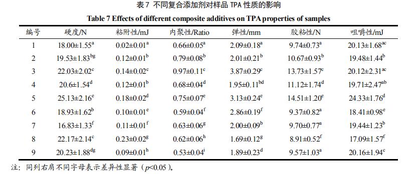 依照1.2.3的方式 ,根據(jù)TPA檢測科學(xué)研究了不一樣復(fù)合型添加物對紅薯粉試品特性的危害,結(jié)果如表9所顯示。