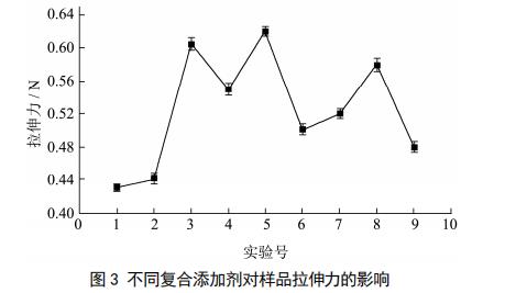 科學(xué)研究了不一樣復(fù)合型添加物對紅薯粉試品的拉長力及其斷條率的危害,結(jié)果如圖所示3、圖4所顯示。
