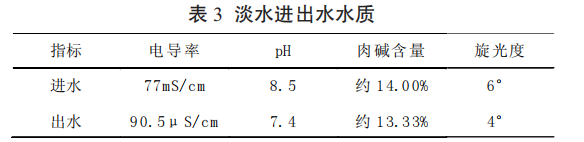 100μS/cm 下列,伴隨著純凈水的配制降低,談水的旋光度慢慢增 高,從表 2 中還可以看得出,除第一次試驗(yàn)外,后 5 批號中濃水排水管道的 旋光度很小,側(cè)邊體現(xiàn)肉堿的占比極低。根據(jù)估算剖析肉堿的損失率很小。融合表 1 和表 2 最后確認(rèn)了純凈水與原材料的較佳比例為 1:0.814,生產(chǎn)制造原材料液與濃水排出比為 1:2.85。