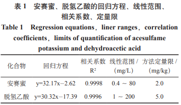 將少量的安賽蜜規(guī)范貯備液、脫氫乙酸規(guī)范貯備液混和,逐步稀釋液成混和規(guī)范系列產(chǎn)品水溶液開展測量(安賽蜜濃度值分別為0.4、4、20、40、80mg/L,脫氫乙酸濃度值分別為1、10、50、100、200mg/L)。各自于己測物的峰總面積為縱軸y,濃度值(mg/L)為橫坐標(biāo)軸x,制作標(biāo)曲。結(jié)果顯示,安賽蜜在0.4~80mg/L濃度值范疇展現(xiàn)較好的線性相關(guān);脫氫乙酸在1~200mg/L濃度值范疇展現(xiàn)較好的線性相關(guān)。兩成分的線形線性回歸方程、相關(guān)系數(shù)r見表1。以頻率穩(wěn)定度為10(S/N=10)測算兩成分在醬腌菜中的定量限,定量限見表2。