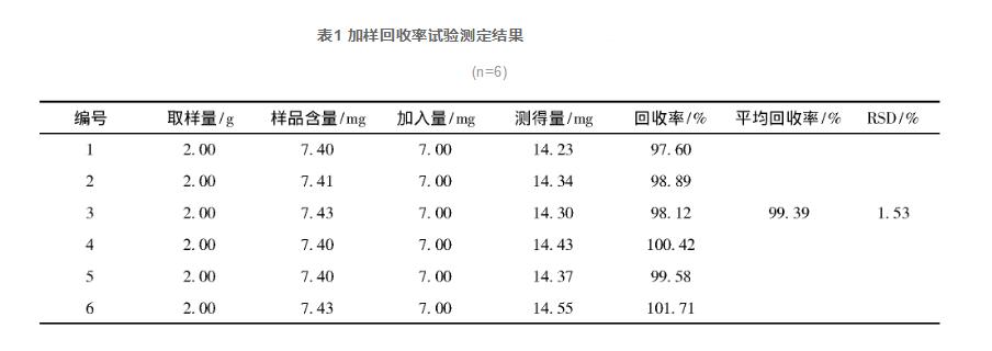 高精密稱量已經(jīng)知道成分的等品質(zhì)鎧甲草細(xì)粉6份,每一份2.00g,各自高精密添加同一濃度值的齊墩果酸標(biāo)準(zhǔn)品,按以上“2.2”的獲取方式平行面制取成供樣品水溶液,于“2.3”項(xiàng)色譜儀標(biāo)準(zhǔn)下測(cè)量,測(cè)算獲得均值利用率結(jié)果為99.39%,RSD為1.53%。說明該方式測(cè)定的效果有優(yōu)良精確性。結(jié)果見表1。
