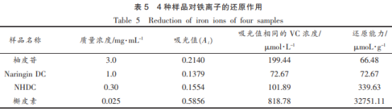 科學(xué)研究了柚皮苷、NariNgiNDC、NHDC及原兒茶醛4種試品對鐵離子的氧化作用,以VC為對比,以其濃度值-吸光度值制作標(biāo)曲y=0.0006x 0.0943(R2=0.9998),4種試品對鐵離子的氧化作用以VC的相同復(fù)原工作能力時的使用量表明,結(jié)果如表5所顯示。