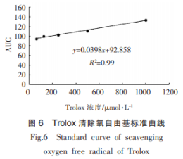以TroLox為對比,以其濃度值-吸光度值制作標(biāo)曲y=0.0398x 92.858(R2=0.99),科學(xué)研究柚皮苷、NariNgiNDC、NHDC及原兒茶醛4種試品對自由基的清理實際效果,結(jié)果見圖6。依照1.2.4節(jié)方式統(tǒng)計分析試品各含量的AUC值,4種試品對自由基消除實際效果以TroLox的抗氧化性摩爾質(zhì)量表明,結(jié)果見表6。