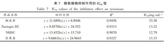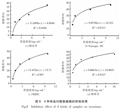 柚皮苷、NariNgiNDC、NHDC及熊果素4種試品對酪氨酸酶的抑制效果如圖所示8所顯示。依據(jù)不一樣濃度值的各試品對酪氨酸酶的抑制率,選用對數(shù)方程線性擬合,獲得擬合曲線如表7所顯示。依據(jù)線性擬合方程計算獲得iC50值。