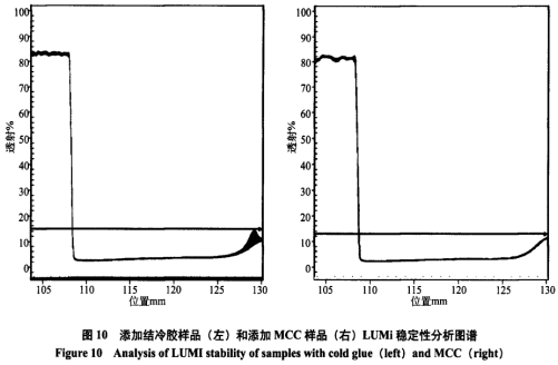 從圖9能夠看得出加上結(jié)冷膠試品和MCC試品的切線斜率較其他二種試品更低,且5組試品的離心式沉積率數(shù)據(jù)顯示加上結(jié)冷膠試品和MCC試品的大顆粒物沉積更少,因而這兩個試品的可靠性更強。下面融合LUMi圖普進一步剖析可靠性。