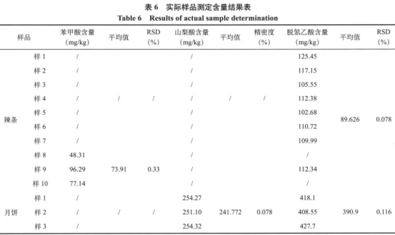 各自稱量點心、月餅、辣皮試品各七個批號,按本實驗確認的試樣前解決辦法和色譜儀標準,制取供標準溶液并上機操作測量,結(jié)果見表6,試品色譜見圖5(每一個類型挑選一種一個批號),從結(jié)果由此可見,歸類為點心的試品所檢驗下來的山梨酸、脫氫乙酸成分均合乎GB27602014中有關(guān)山梨酸和脫氫乙酸較大需求量的規(guī)定,與此同時并沒有檢驗出苯甲醛及其糖精鈉,也做到檢驗規(guī)定。