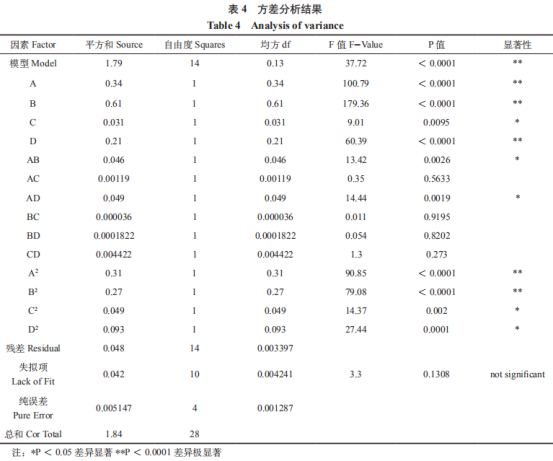 Y=3.87 0.17A 0.23B 0.05C 0.13D 0.11AB-0.017AC 0.11AD-0.003BC-0.00675BD 0.033CD-0.22A2-0.2B2-0.087C2-0.12D2