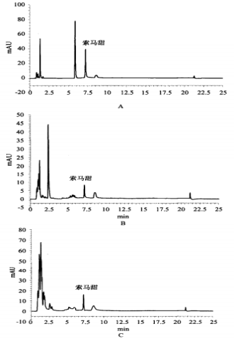 選用文中所確立的辦法對市面上的15個批號的飲料類商品(包含炭酸類飲品可口可樂、可樂,茶類飲料綠茶、綠茶葉、花草茶,果肉飲料,維他命飲品)開展剖析檢驗,均未發(fā)覺索馬甜的驗出,與其說商品標(biāo)簽成份中未明確應(yīng)用索馬甜的狀況一致。