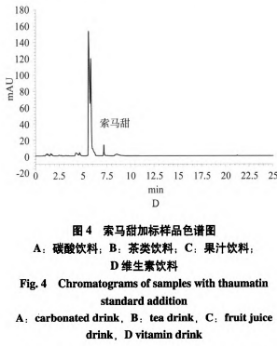 為認(rèn)證辦法的可行性分析,進一步對飲品試品開展加標(biāo)實驗。在這里全過程發(fā)覺,立即向各種飲品中添加索馬甜,均沒法驗出,剖析其根本原因可能是因為各種飲品中高濃的糖成分造成蛋白質(zhì)聚沉所致使的,因而,加標(biāo)回收實驗均是在對飲品開展10倍稀釋液后的根基上加上。不一樣試品的索馬甜加標(biāo)實驗超高效率液相色譜儀結(jié)果如圖4所顯示,索馬甜加標(biāo)回收率及精度實驗結(jié)果見表1。