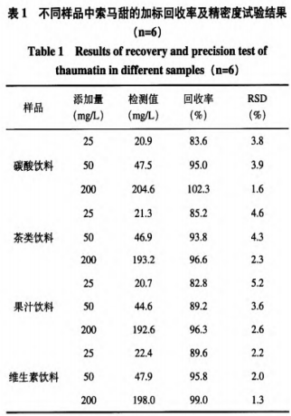 反復(fù)測量20次含有10mg/L索馬甜的栽培基質(zhì)試品,以結(jié)果相對標(biāo)準(zhǔn)偏差的3倍測算出方式的方法檢出限為1.6mg/L,以結(jié)果相對標(biāo)準(zhǔn)偏差的10倍測算出定量限為5.3mg/L,說明該辦法能達到食品類中甜味素的檢查規(guī)定。