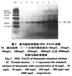 SDS-PAGE是剖析蛋白常見的方式 ,可以完成判定及半定量分析。配置不一樣含量的索馬甜蛋白質(zhì)水水溶液,其SDS-PAGE結(jié)果如圖所示5所顯示。