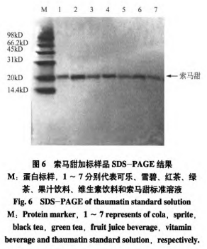 對各種飲品開展10倍稀釋液后任意加上不一樣濃度值索馬甜標(biāo)液,依照上述情況的電泳分析方式實現(xiàn)解決并電泳原理,其效果如圖所示6所顯示。由圖上能夠看得出,各加標(biāo)試品電泳條帶與索馬甜規(guī)范試品一致,不難看出運用SDS-PAGE法可以完成對飲品中索馬甜開展剖析。