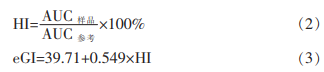 以淀粉水解率是縱軸,時間為橫軸制作試品水解反應(yīng)曲線圖。測算試品和規(guī)范食品類在0~180min期內(nèi)淀粉水解曲線圖下的面(AUC試品和AUC參照)。試品淀粉水解指數(shù)值(HydroIySiSindex,Hi)依照公式計算(2)測算。試品的eGi根據(jù)公