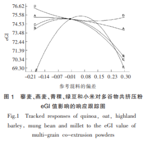 為剖析各谷類加上量相融壓擠粉eGi值的關(guān)聯(lián),選用回應(yīng)追蹤圖來(lái)體現(xiàn)各要素對(duì)eGi值的危害,結(jié)果見(jiàn)圖1。在E(小米手機(jī)加上量)40%~50%范疇,eGi值隨小米手機(jī)加上量的提高呈顯著的先升高后下降趨勢(shì)。燕麥片、青稞加上量超出核心誤差水準(zhǔn)后,eGi值降低顯著。黎麥、黑豆加上量對(duì)eGi值危害不顯著。